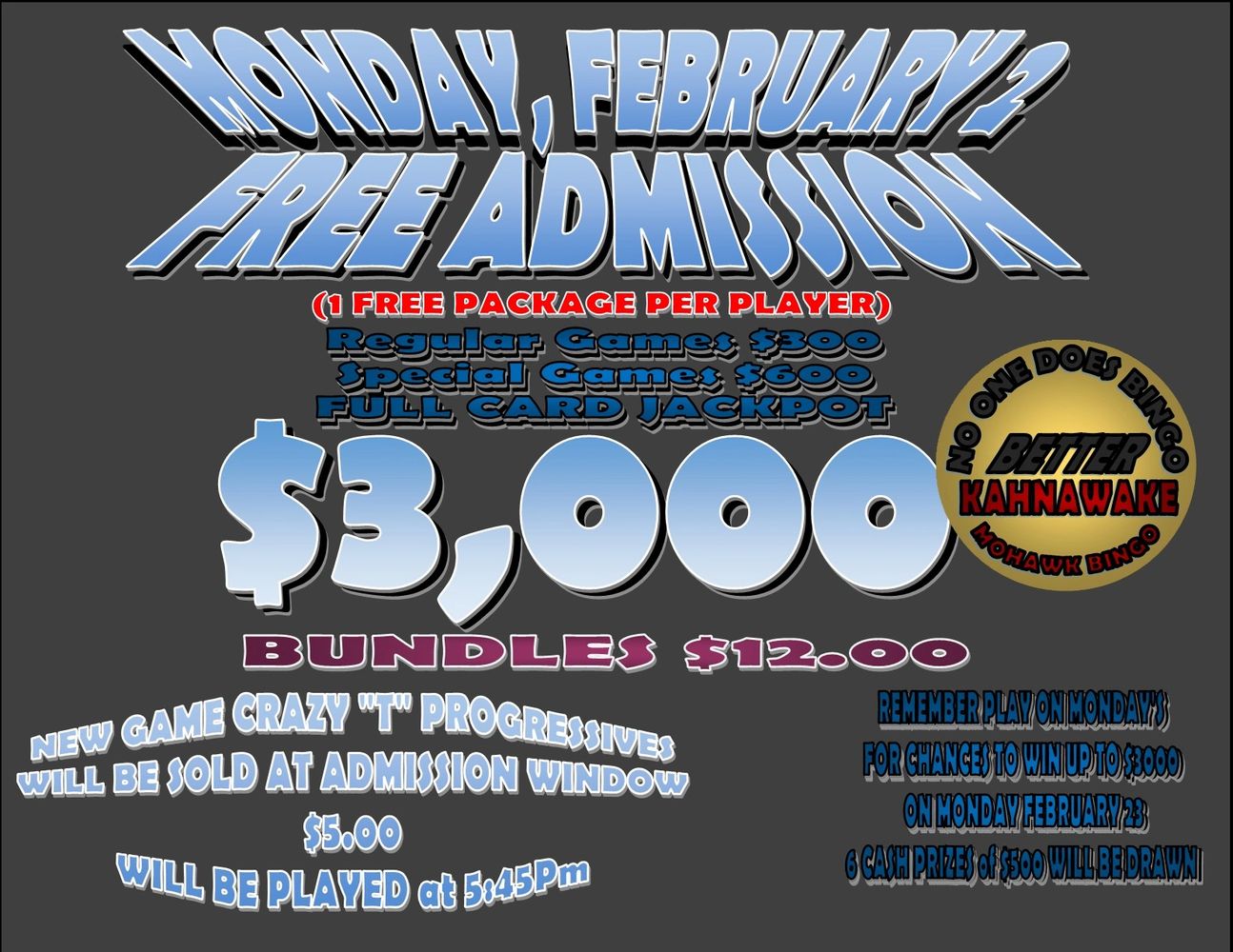 KAHNAWAKE MOHAWK BINGO is not responsible for lost, stolen or damaged cards. Refunds will NOT be issued for un-played cards.