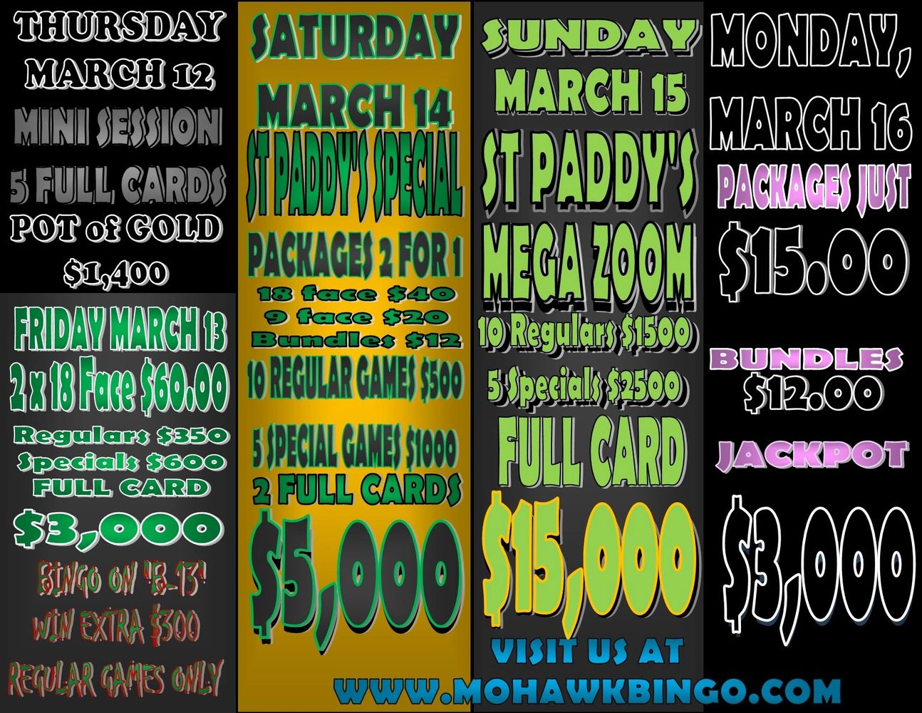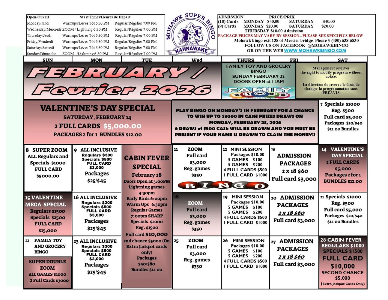 KAHNAWAKE MOHAWK BINGO is not responsible for lost, stolen or damaged cards. Refunds will NOT be issued for un-played cards.